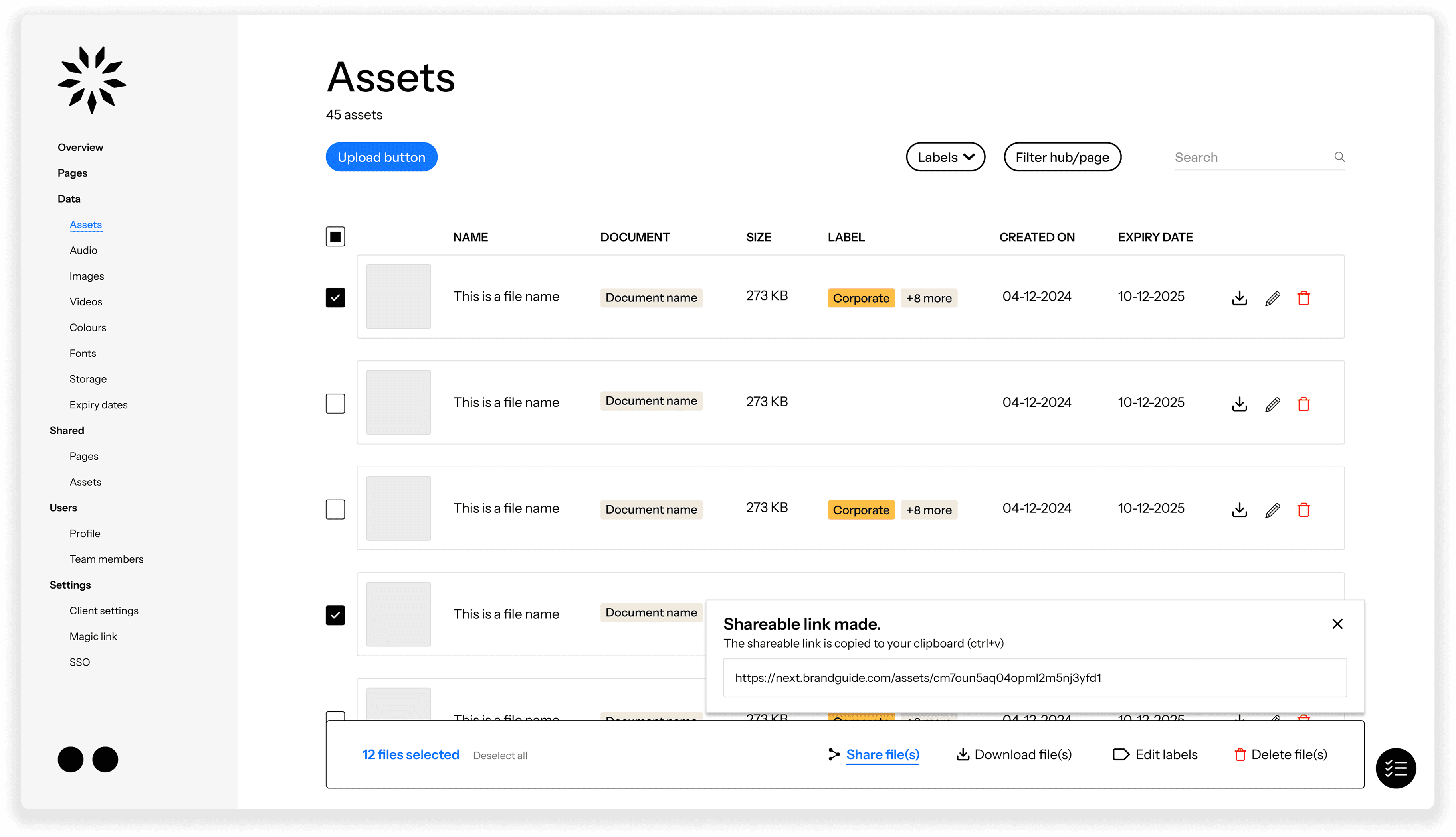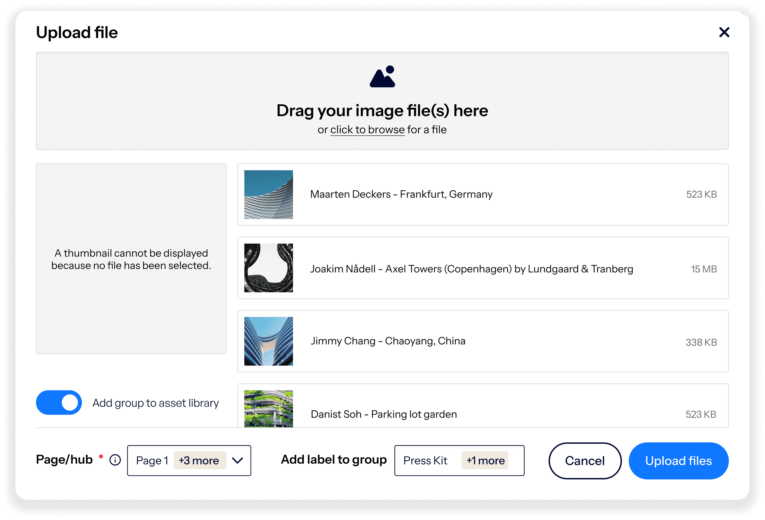 Gebruikers konden eerder alleen één bestand tegelijk uploaden. Ik heb bulk-upload flows ontworpen en later de DAM-functionaliteit toegevoegd, waardoor klanten hun assets beter konden organiseren en beheren, terwijl bestaande navigatie en hiërarchie behouden bleven.